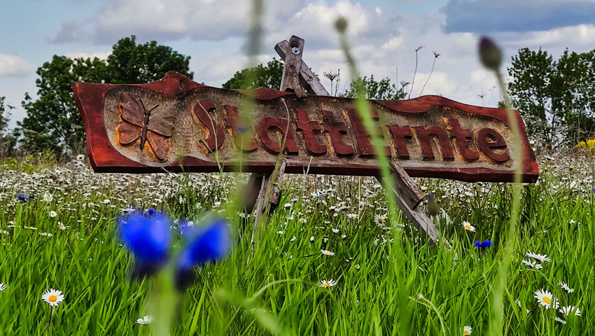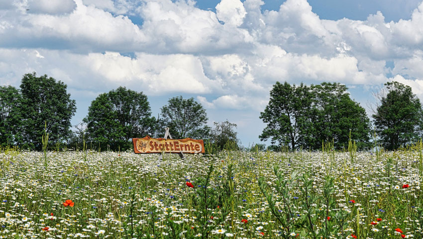 Die StattErnte Fläche hat zu blühen begonnen. Immer als Erstes dabei: Die Margeriten, die alles in Weiß tauchen, auch wenn es manchmal noch etwas umwölkt ist.