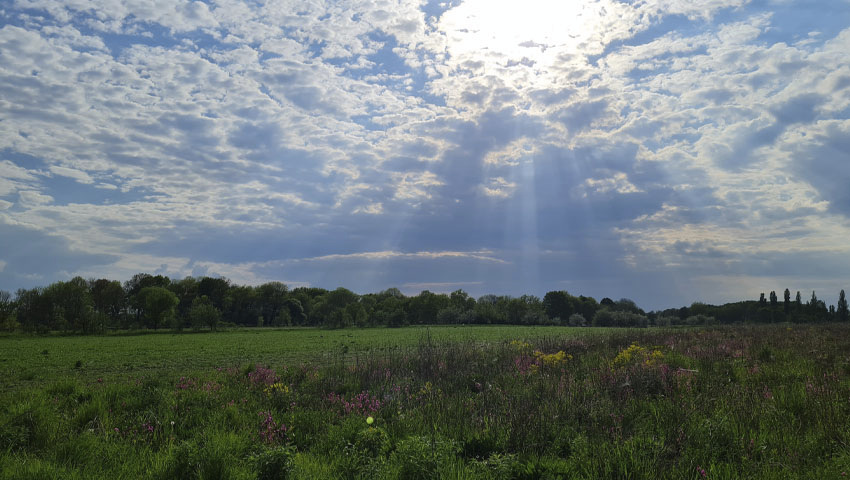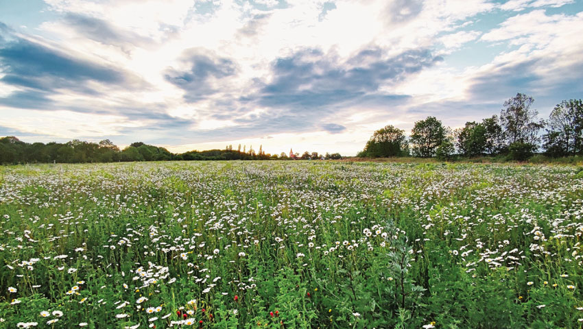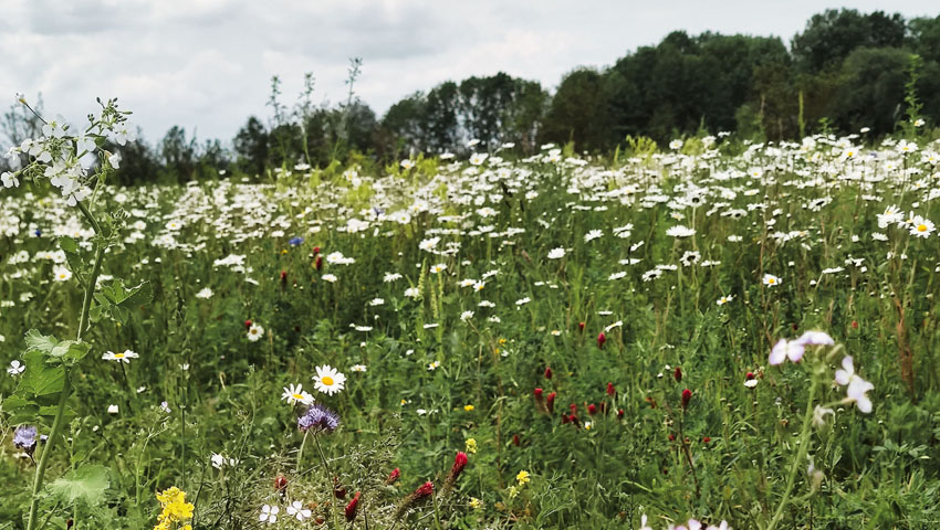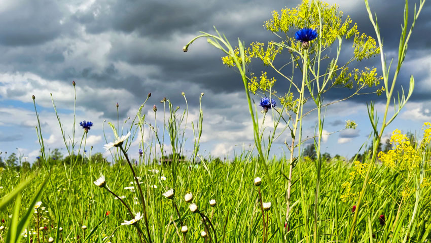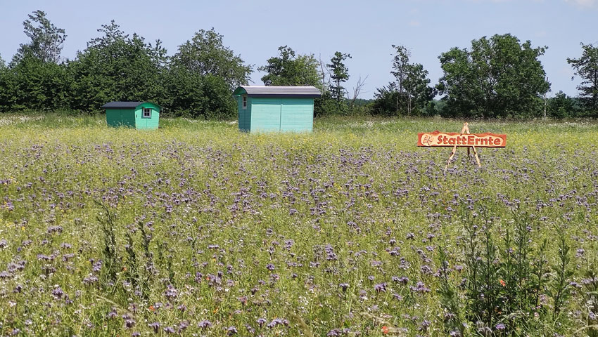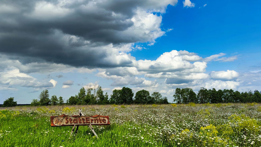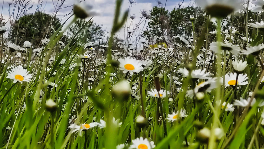 Die StattErnte Fläche hat zu blühen begonnen. Immer als Erstes dabei: Die Margeriten, die alles in Weiß tauchen, auch wenn es manchmal noch etwas umwölkt ist.